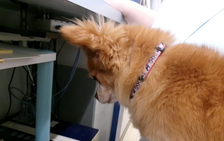 先輩のお膝にのせていただいているのに、うつむいて悲壮感漂うチワワ