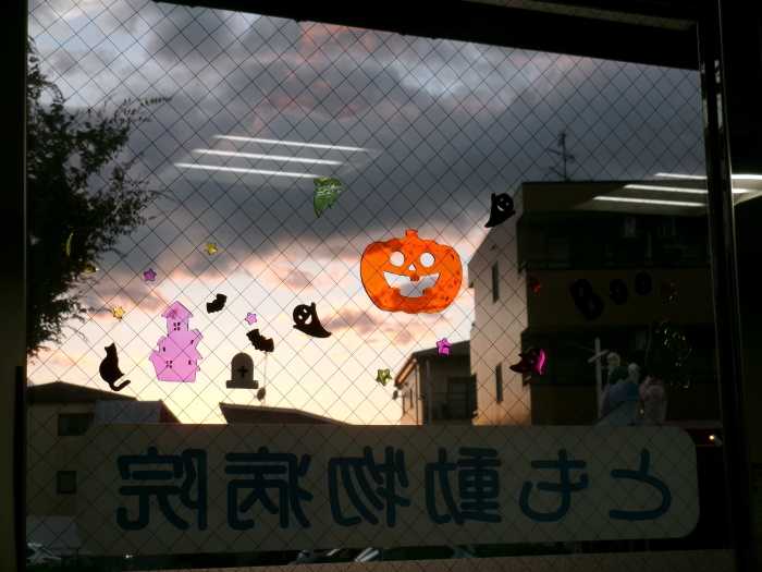 当院もガラス扉がハロウィン仕様に!夕焼け背景、昼から夜に変わるまさに「逢魔(おうま)が時(とき)」に映えますね。