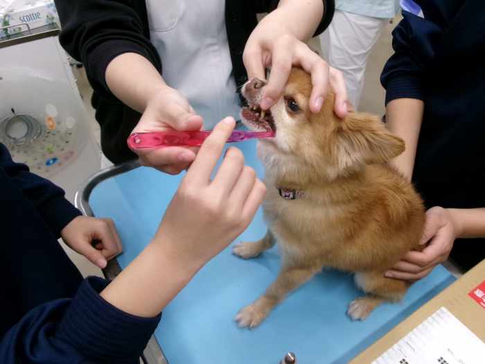 皆さんこんにちは看護師の喜屋武(キヤタケ)です。トライやるウィーク(中学生の職業体験)がありました。獣医療的な実務は見学のみになりますが、病院わんこを引き連れてのお散歩や歯ブラシのレクチャーなどを行っています。 まろん君はおとなしいので大変協力的にチュートリアルをまっとうしてくれています。