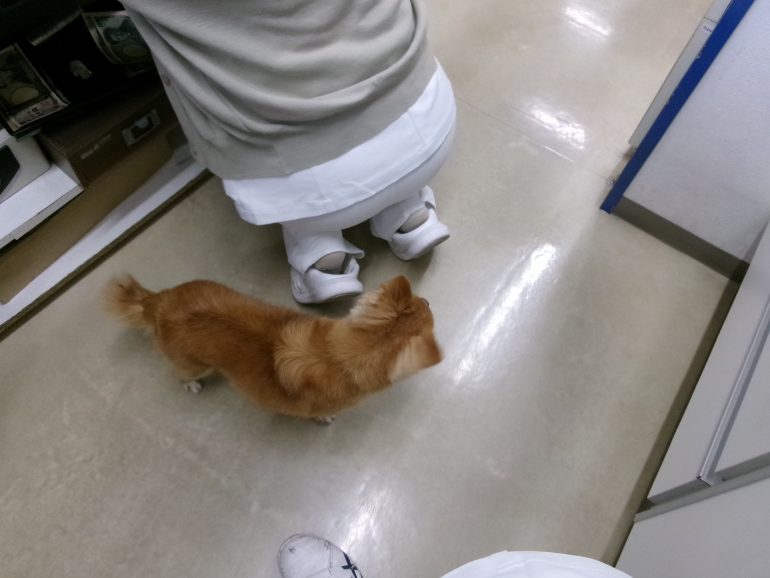 するとこんな感じでまろん君が受付にそそくさと逃げてきて様子をうかがっています笑