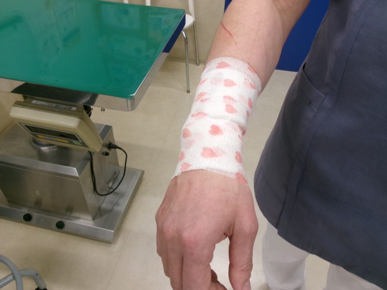 先生は気合タイプなのでいつも治療せず放置していることが多いですが、今回はあまりにも出血が止まらなかったので包帯を巻かせていただきました🤕